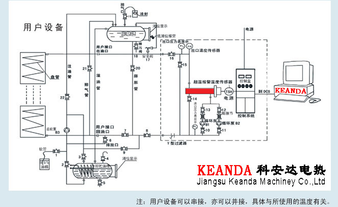 導(dǎo)熱油爐(又稱導(dǎo)熱油加熱器)是將是將電加熱器直接插入有機(jī)載體(導(dǎo)熱油)中直接加熱,利用循環(huán)泵,強(qiáng)制導(dǎo)熱油進(jìn)行液相循環(huán),將熱量傳遞給用一個(gè)或多種用熱設(shè)備,經(jīng)用熱設(shè)備卸載后,重新通過(guò)循環(huán)泵,回到加熱器,再吸收熱量,傳遞給用熱設(shè)備,如此周而復(fù)始,實(shí)現(xiàn)熱量的連續(xù)傳遞,使被加熱物體溫度升高,達(dá)到加熱的工藝要求。
